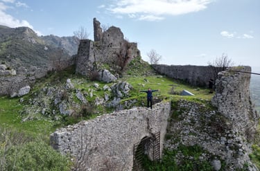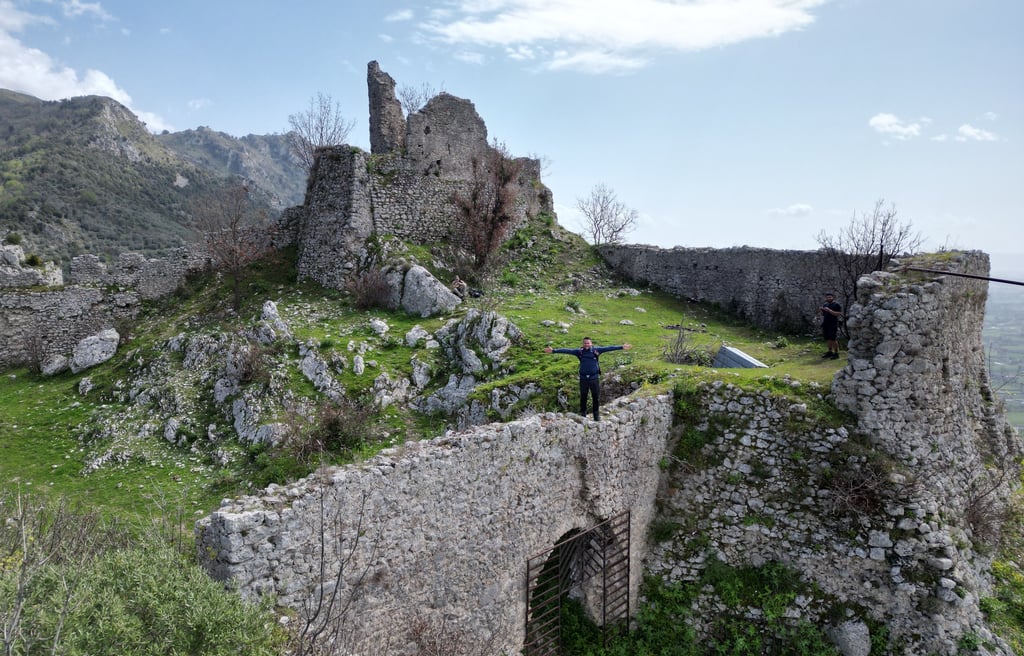 Ammiriamo dei rapaci, forse poiane, volteggiare nel cielo prima di proseguire l’esplorazione verso i ruderi del Castello dei Conti di Aquino.