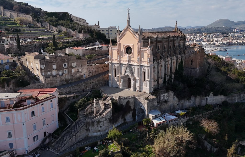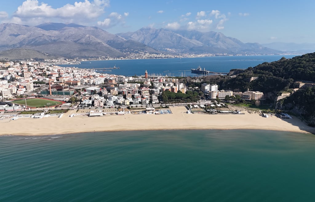 La vediamo infatti dall’alto, incastonata nel blu del golfo, e sorvolata dai gabbiani; risaltano il Torrione Francese e i due castelli, l’Angioino e l’Aragonese. Quest’ultimo, oggi sede della scuola nautica della Guardia di Finanza.